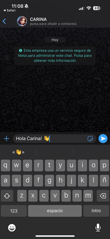 Para empezar a usar Carina en WhatsApp, tienes que abrir el móvil y entrar en la web oficial de la IA con tu navegador, en carina.chat. Una vez estés dentro, verás que aparece algo parecido a un chat, y en esta ventana tienes que pulsar en el botón de enviar mensaje que aparece abajo a la derecha con el icono de una flecha en verde.